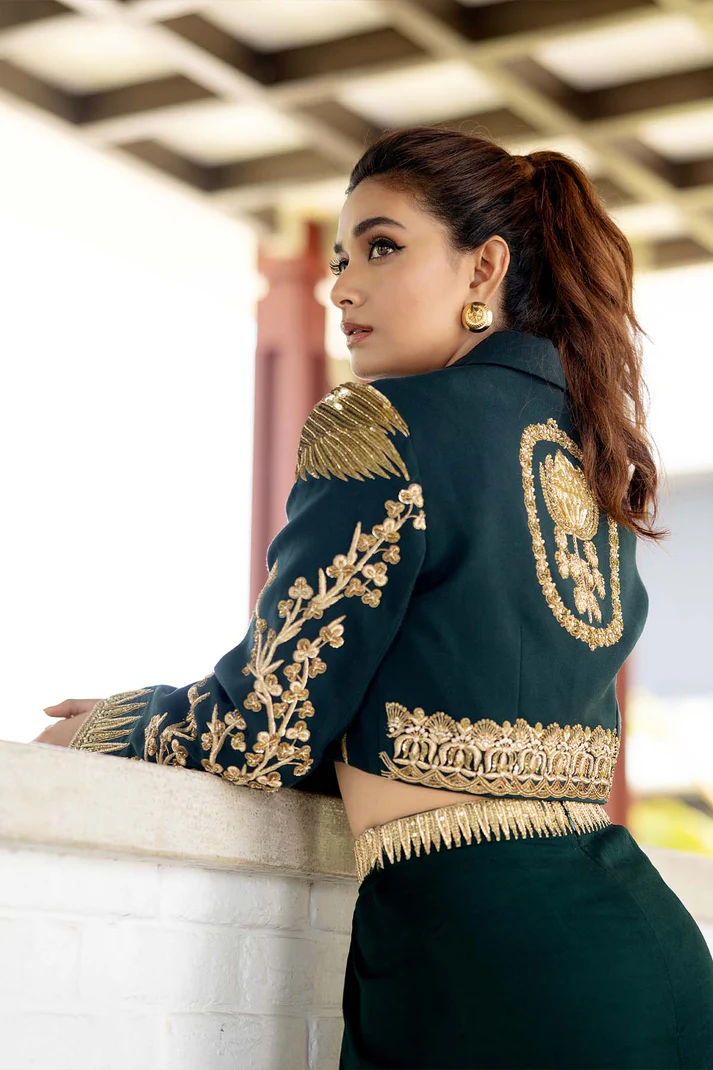 The Paan Petha Set, a fusion outfit that blends traditional artistry with contemporary style. This captivating ensemble features a crop jacket, richly embroidered with zardozi, dabka, and moti work, reflecting the opulence of Indian craftsmanship. The jacket is adorned with enchanting motifs like the Son Chidiya and Berry bel, symbolizing grace and natural beauty, making this piece truly one-of-a-kind. The ensemble is completed with a draped skirt, designed with a flattering V-cut waist that adds a modern flair to the traditional silhouette. The Paan Petha Set is perfect for those who seek to make a statement with timeless elegance and a touch of whimsy, ideal for weddings, festive occasions, or any event where you wish to stand out with grace and charm."